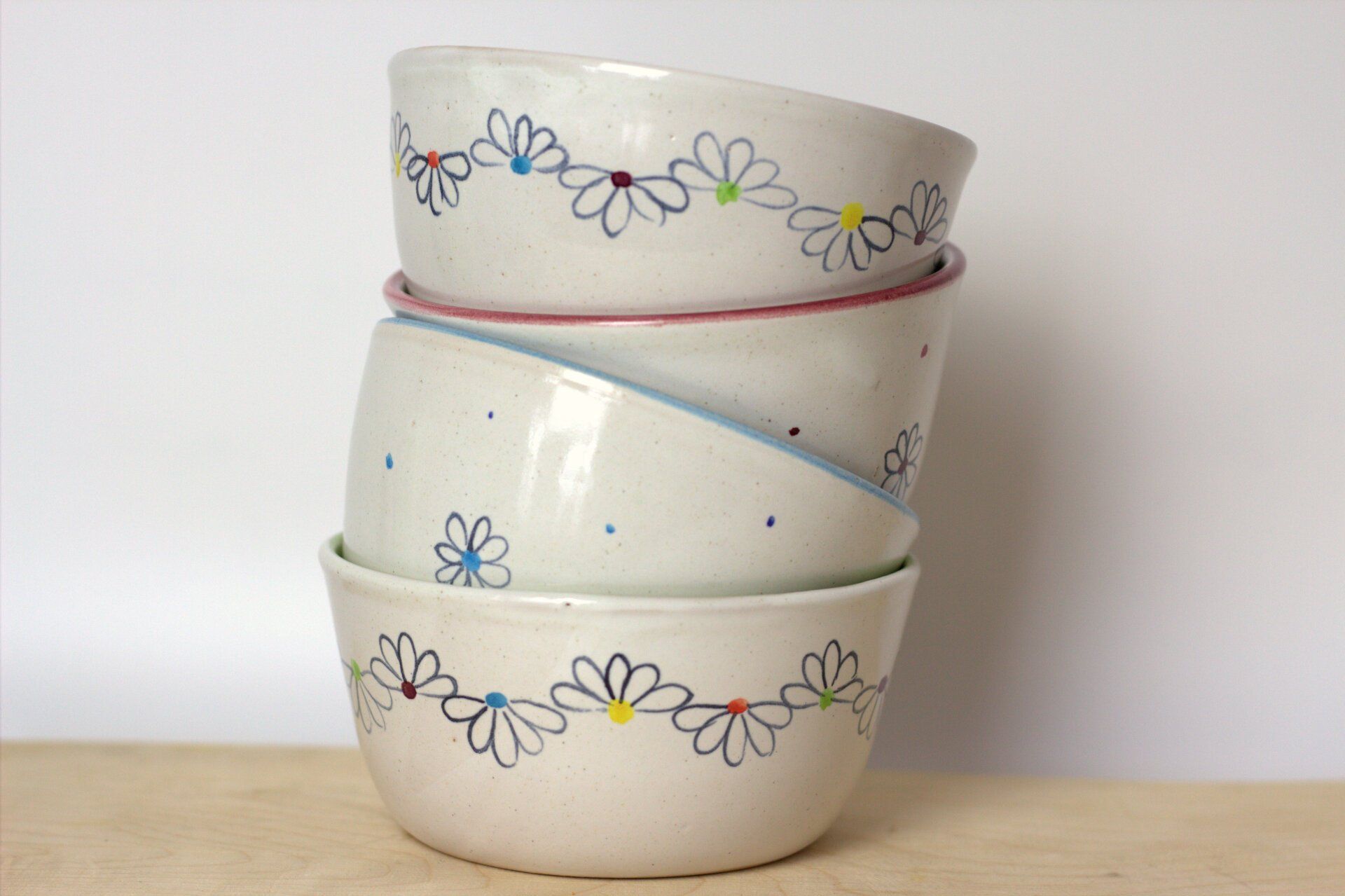 Müslischale, freigedreht auf der Töpferscheibe, weiss glasiert, von Hand einzeln bemalt.