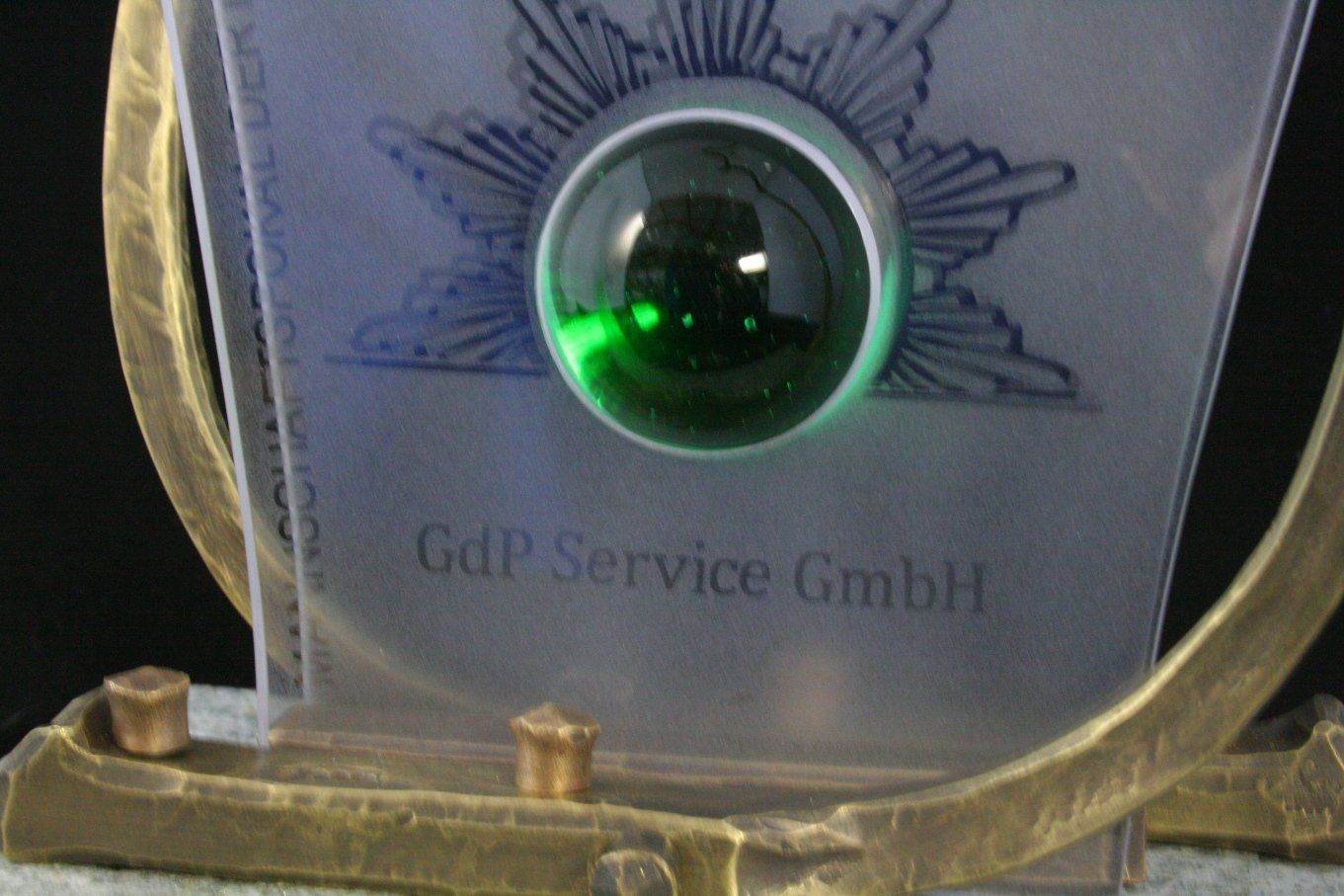 Die doppelte Acrylplatte ist mit dem Logo der Veranstaltung sandgestrahlt,